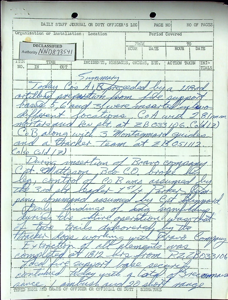 Following the successful insertion of Alpha Company, the 119th AHC flight lead, callsign Gator 523, led his helicopters to Fire Support Base #6, where Bravo Company, under the command of Captain Matteson, waited for their own combat assault. The company would be joined by three Montagnard guides and a US Army dog tracker team. The first Bravo troops landed in another cold LZ at 0949 hours.