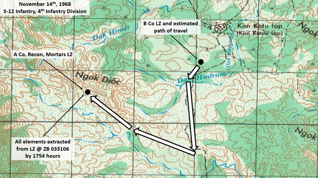 On November 14th, 1968, elements of Alpha & Bravo Companies, along with men from the battalion Recon and Mortar platoons of the 3/12 Infantry received orders to combat assault into separate landing zones (LZ) southeast of the battalion firebase on Hill 1338. Alpha Company, the Recon Platoon and two 81mm mortar crews were up first. The landing, accomplished by at least 12 sorties of Huey aircraft from the 119th Assault Helicopter Battalion, was uneventful. Alpha Company, under the command of Captain Donald Androsky, began to move through pre-designated checkpoints around the southern slope of Hill 770. Recon Platoon established a small perimeter near the LZ, and the mortar crews set up their 81mm tubes, ready to deliver fire support if needed.